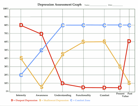 Notice, though, that functionality is only slightly enhanced during the lowest levels. The reason appears to be due to the inability to recognize low intensities (as mentioned in the awareness article). When we teach how to recognize depression or hypo-mania earlier, students become aware of the optimal level where functionality is at eighty percent or higher. This “Comfort Zone” is illustrated by the blue C scores in the graph.